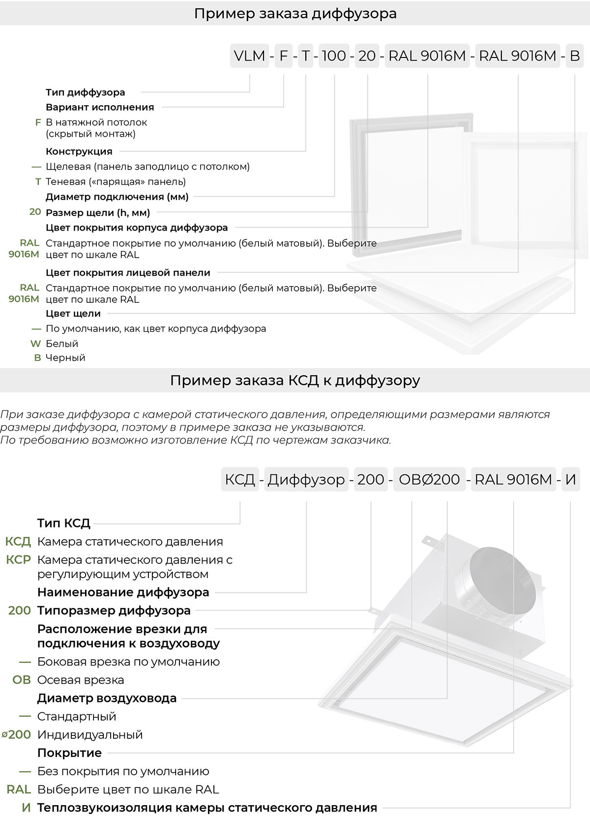 Рамка диффузора VLM-F изготавливается из экструдированного алюминиевого профиля АД31 по ГОСТ 22233-2018. Лицевая панель - из оцинкованной стали 0,9 мм. По умолчанию корпус диффузора и лицевая панель окрашиваются в белый цвет RAL 9016М матовый. По индивидуальному заказу возможна окраска в любой цвет по шкале RAL. КСД изготавливается из оцинкованной листовой стали 0,4 - 1,5 мм в зависимости от размера и пожелания заказчика. По умолчанию КСД поставляется в неокрашенном виде.